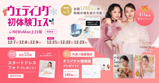 「PLACOLE & DRESSY」ブランドを展開する冒険社プラコレ(本社:神奈川県鎌倉市、代表取締役CEO:武藤功樹)は、横浜駅直結JR横浜タワー21F、ウェディングの魔法にかかる空間"DRESSY ROOM YOKOHAMA"にて、2024年12月7日(土)~9日(月)の3日間限定で、これから結婚式をお考えのカップル様に向けた、個室相談やウェディングドレス試着ができる豪華特典付きのウェディング初体験フェスを開催いたします。(40組様限定、無料開催)