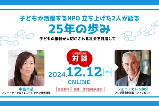 認定NPO法人フリー・ザ・チルドレン・ジャパン(所在地:東京都世田谷区南烏山6-6-5-3F、代表:中島早苗)創立25周年記念事業の第3弾として、フィリピンのNPO「プレダ基金」創設者のシェイ・カレン神父と当団体代表中島早苗のオンライン対談を12/12(木)19:00~21:00開催いたします。プレダ基金は、性虐待を受けた少女や刑務所で不当な扱いを受けている子どもたちを救出・保護し、心理的サポートや教育を通してその自立を支援するNPOです。子どもの権利が大切にされる社会を目指す日本とフィリピン2つのNPOの代表がこれまでの活動の成果とこれからの社会について語り合います。