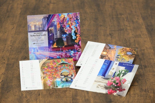 毎年好評いただいている日比谷花壇のオリジナルカレンダー。2025年版は、当社設立75年の歴史の中で初の試みとして生成AIの技術を活用しました。『The New Era of Floral Art』をテーマに、日比谷花壇グループが誇るフローリストたちがデザインした実在の生花によるリアルなフラワーアレンジメントと、AI技術によって生みだした世界の風景を想わせるバーチャルな空間画像を合成し、人間の感性とAIによるデジタルな創造が融合した新しい形のフラワーアートへと仕上げました。