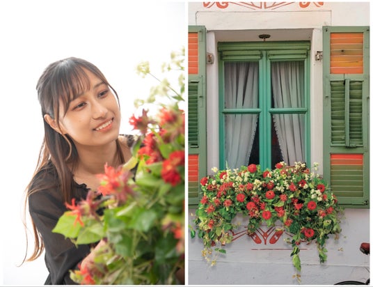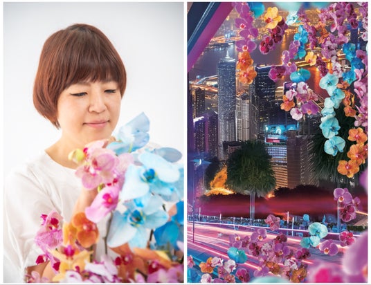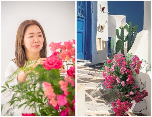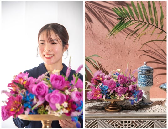 その後、プロのカメラマンと共に花の向きや光を調整し、アレンジメントを撮影。最後に、生成AIによって生み出された風景画像と実際に撮影した生花アレンジメント画像とを「そこにある花」として合成・調和させ、これまでにない一枚のアートとして仕上げました。