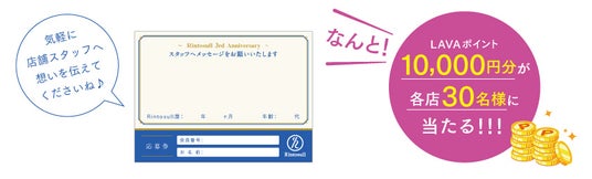 2024年12月1日(日)~12月25日(水)の期間、Rintosullをご利用いただく会員様を対象に3周年アニバーサリーメッセージ抽選会を実施します。Rintosull店頭にてお渡しするメッセージカードが応募券となり、メッセージを記入・応募いただいた方から抽選でLAVAポイント10,000円分を各店30名様にプレゼントします。