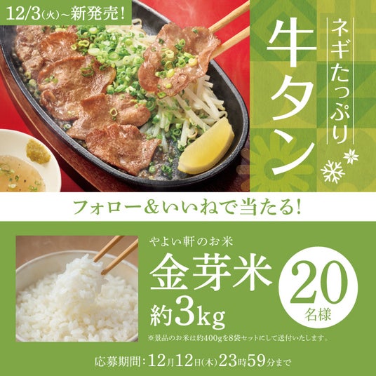 このたび日本国内の「やよい軒」では、やよい軒公式X・公式Instagramにおいて、『ネギたっぷり牛タン定食』発売を記念して、おいしさだけでなく健康にもこだわった「金芽米」がもらえるプレゼントキャンペーンを実施いたします。