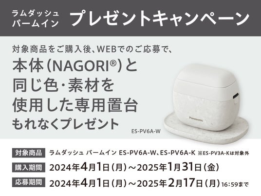 2024年4月1日~2025年1月31日の期間中に対象商品をご購入の上、WEBからご応募いただいたお客様全員に、ラムダッシュ パームイン本体と同様の素材を使ったNAGORI(R)製専用置台をもれなくプレゼントいたします。