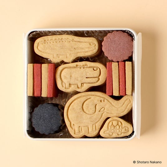 今回コラボレーションするクッキー缶は、絵本に登場する、ぞうくんが散歩中に出会ったかばくん、わにくん、かめくんをクッキーで再現し、絵本のお話にもなっている背中にのっている様子が缶のふたを開けると広がります。クッキーは全32枚ぎっしりと詰まっています。