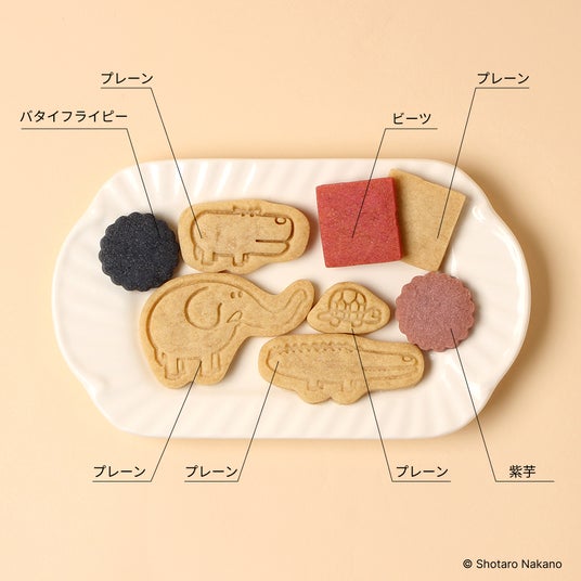 中に入っているクッキーは「お子さまもご家族もいっしょに美味しく召し上がってほしい」という想いから、原材料にもこだわり、「小麦・卵・乳」不使用です。小さなお子さまに寄り添った商品を目指し、保存料、香料、着色料も使用しておりません。「紫いも」「ビーツ」味のクッキーは、野菜パウダーを使用していますが、野菜が苦手なお子さまも食べやすい味にしています。