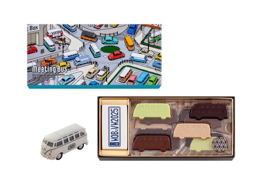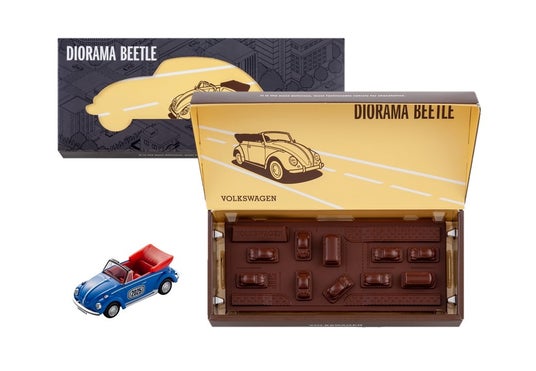 ふたを開くと、ビートルやバスが行き交う街並みが広がるユニークなひと箱。精巧にできたジオラマをイメージしたタブレットプレーンチョコレートです。個性的な赤いシートの、ブルーのカブリオレミニカー付き。