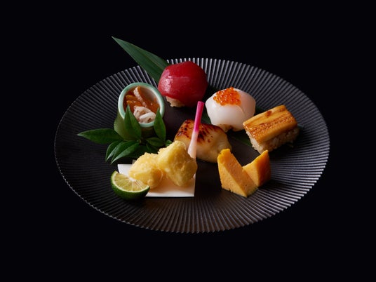 赤酢のシャリで寿司職人が握る手毬寿司や西京味噌とみりんにじっくり漬け込んだ銀鱈を、香ばしく焼き上げた「銀鱈の西京焼」など色合い豊かに一口サイズでお愉しみいただける日本料理、和をイメージしたプレートが新登場です。