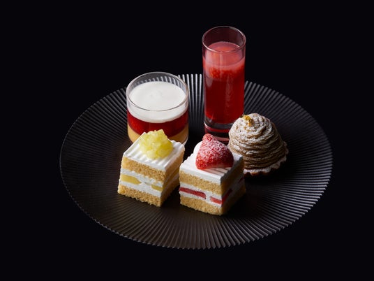 (左奥より時計回りに)あまおうプリン、あまおうゼリー、モンブラン、新スーパーあまおうショートケーキ、スーパーメロンショートケーキ