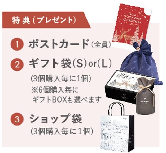 今年はプレゼント特典として、クリスマスコフレご購入のお客様全員にオリジナルクリスマスカード、そしてショップ袋とギフト袋またはギフトBOX※1(コフレ対象アイテム3個につき1個)をプレゼントいたします。
