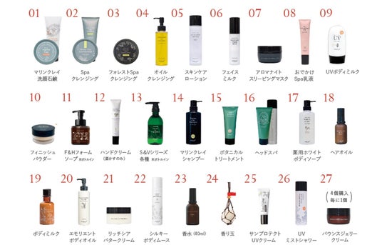 ・対象商品: マリンクレイ洗顔石鹸、Spaクレンジング、フォレストSpaクレンジング、オイルクレンジング、スキンケアローション、フェイスミルク、アロマナイトスリーピングマスク、おでかけSpa乳液、UVボディミルク、フィニッシュパウダー、F&Hフォームソープ、ハンドクリーム(酒かすのみ)、S&Vシリーズ各種、マリンクレイシャンプー、ボタニカルトリートメント、ヘッドスパ、薬用ホワイトボディソープ、ヘアオイル、ボディミルク、エモリエントボディオイル、リッチシアバタークリーム、シルキーボディムース、香水(40ml)、香り玉、サンプロテクトUVクリーム、UVミストシャワー、バウンスジェリークリーム