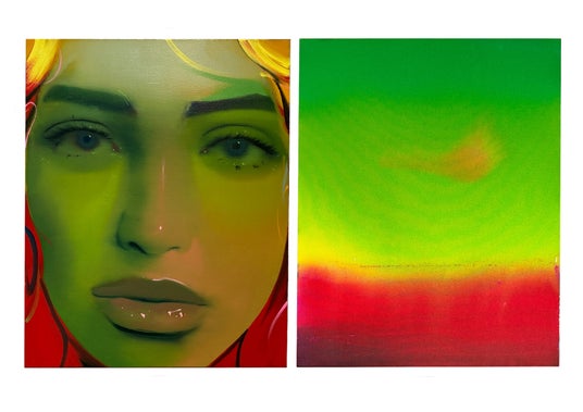 cocoro nakauraは、デジタルデバイス上に存在する情報をポートレートとして抜き出したものと、目の前に実際に広がる風景をステイニング(※)という技法を用いながら表現しています。その両者を同一画面上に存在させることで、デジタルとフィジカルが交差する現代の”今”を紡いでいます。目の前の事実と、手のひらから即座に世界へアクセスできる事実。cocoroの作品は、それらが自然と我々の日常や風景に溶け込んでいることを再認識させます。