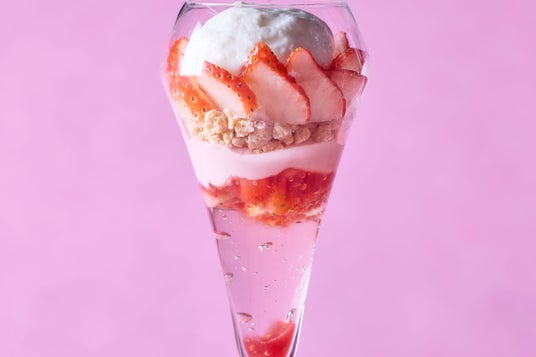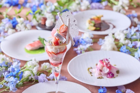 上段は、フレッシュいちごやいちごマカロンを使用し、いちごのモンテ(クリーム)の中にすっきりしたレモンムースを忍ばせ、爽やかな風味に。更に、銀箔輝くオパリーヌ(飴細工)や、いちごの花をイメージしたエディブルフラワー、真っ白な棒メレンゲを添え、華やかな見た目にもパティシエのこだわりが詰まっています。下段には、いちごのソルベやいちごのコンカッセを使用しつつ、マスカルポーネのエスプーマ(泡)とコーヒーを染み込ませたジェノワーズ(スポンジ生地)で“ティラミス”仕立てに。甘くクリーミーなティラミスと、いちごの甘酸っぱさが絶妙にマッチしたご褒美パフェをお楽しみください。