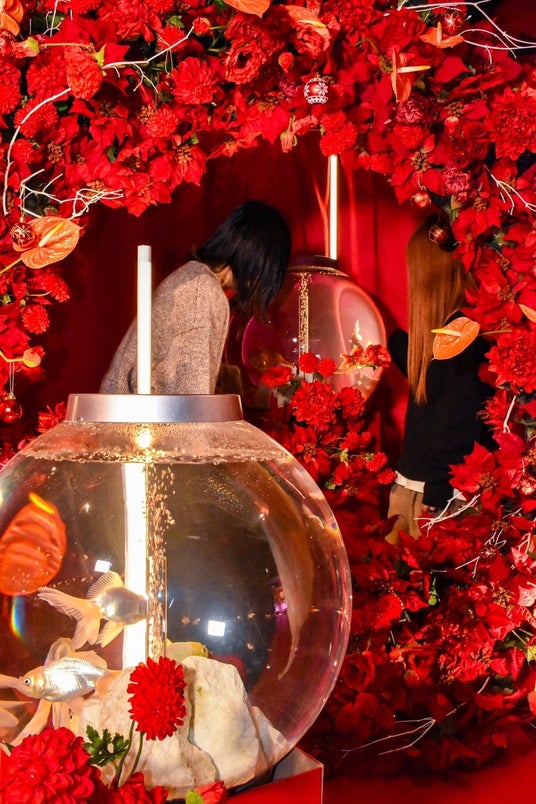 約2メートルのクリスマスリースを中心に、雪をイメージした白い金魚やユニークな模様の金魚が展示され、訪れる人々に特別なクリスマス体験を提供します。イルミネーションのように輝く金魚たちが作り出す空間は、訪れる人々を魅了すること間違いなし。