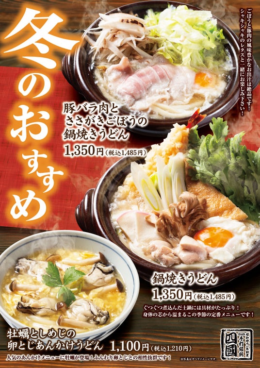 1966年、うどんの本場・香川県丸亀市で「うどん」専門店を開業し、「讃岐うどん」の美味しさを世に広めてきた「饂飩の四國」。冬の味覚たっぷりの「うどん」3メニューを12月2日(月)より期間限定で販売いたします。ごぼうと豚肉の風味豊かなお出汁が際立つ「豚バラ肉とささがきごぼうの鍋焼きうどん」に日本の冬の定番うどん「鍋焼きうどん」そして、旬なグルメの代表格・牡蠣を使用した「牡蠣としめじの卵とじあんかけうどん」でございます。どれも寒い季節に、ほっこり美味しさを感じていただける「うどん」をご用意いたしました。皆さまのご来店をスタッフ一同お待ちしております。どうぞご利用ください。