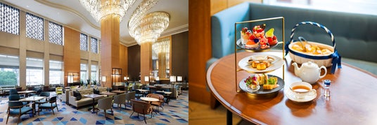 ネイビーブルーを基調とした3階まで吹き抜けのゆったりとした空間で、旬のフルーツを使用した人気のアフタヌーンティーセットや、ホテルならではのこだわりのメニューをお楽しみいただけます。心地よい雰囲気の中で、贅沢なティータイムをお過ごしください。