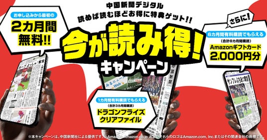 株式会社中国新聞社(代表取締役社長:岡畠鉄也、以下「中国新聞社」)は、12月31日まで「中国新聞デジタル今が読み得!キャンペーン」を実施中。中国新聞デジタルのサービスのうち、「記事読み放題+ビューワー(朝刊)」、「ビューワー(朝刊)」の2プランが対象です。