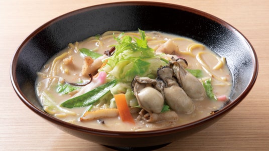 ■ 牡蠣ちゃんぽん 1,146円(税込1,260円)※山口イオン防府店・島根ラピタ本店・香川イオンモール高松店は1,130円(税込1,243円)毎年冬のちゃんぽんと言えば定番の牡蠣ちゃんぽん。長崎ちゃんぽんお馴染みの豚骨スープにぷりぷり食感の大粒の瀬戸内産牡蠣を乗せております。牡蠣と野菜と魚介の旨味が溶け込んだコクのあるスープと共にお楽しみください。
