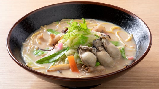 ■ 北海道味噌 牡蠣ちゃんぽん 1,264円 (税込1,390円)※山口イオン防府店・島根ラピタ本店・香川イオンモール高松店は1,260円(税込1,386円)冬の美味しさの代名詞と言えば「牡蠣」。ぷりぷり大粒の瀬戸内産牡蠣を使用したスープと北海道味噌を使用したスープとの相性は抜群で味噌は北海道の「紅一点」を使用。北海道味噌は冷涼な気候の為、長期間熟成することによる豊かな香りとコク、余韻の長い旨味が特徴の味噌で、濃厚な味噌味と牡蠣エキスたっぷりのコラボレーションをお楽しみください。