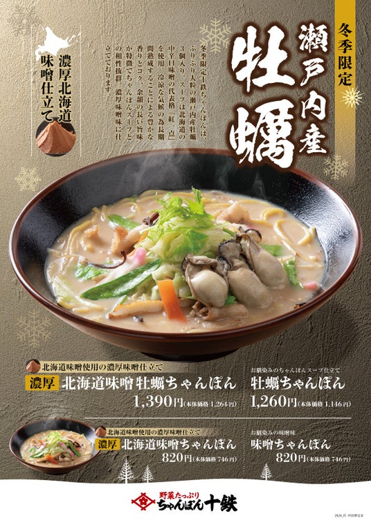 本場・長崎ちゃんぽんの独特の風味と食感が堪能できる「長崎ちゃんぽん十鉄」では12月5日(木)より旬な冬の食材を使用しました期間限定メニューを販売いたします。まずは定番の牡蠣ちゃんぽん。ぷりぷり大粒の瀬戸内産牡蠣3 個の食感と牡蠣の旨味がスープに溶け込んだコクのある海鮮の味をお楽しみください。また今年は北海道味噌を使用した牡蠣ちゃんぽんも選べます。中辛口味噌の代表格「紅一点」を使用し濃厚味に仕立てております。沢山の野菜と牡蠣の旨味と濃厚な味噌味で、体の芯まで温めて、この寒い冬を乗り切りましょう。スタッフ一同、皆さまのご来店をお待ちしております。
