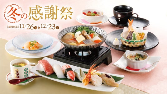 期間限定『冬の感謝祭』として冬の定番を豊富に取りそろえた特別メニュー「冬のあったか小鍋コース」(寿司6貫、石狩小鍋、ほたてカルパッチョ、煮あわびグラタン、天ぷら、季節の茶碗蒸し、デザート、ソフトドリンク)を税込3,580円で販売いたします。
