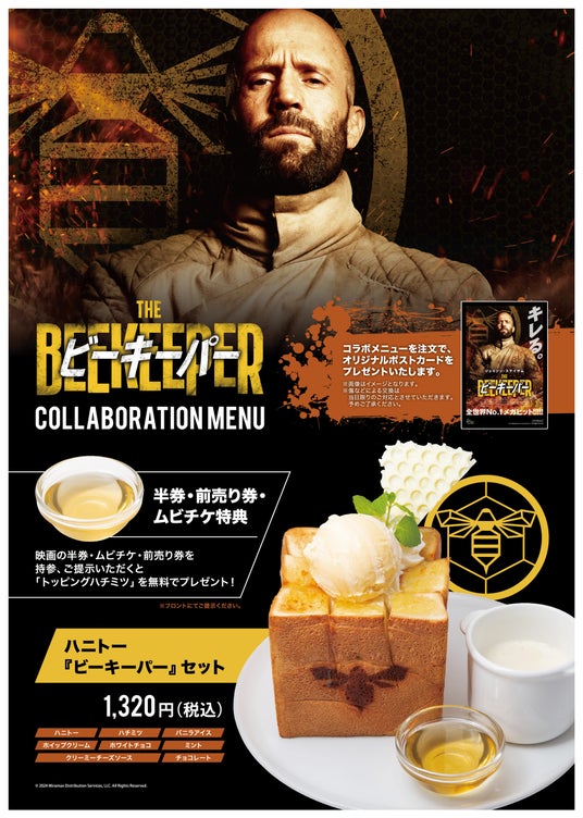 2025年1月3日公開の映画『ビーキーパー』とカラオケパセラ4店舗のコラボが決定!!映画でも登場する"ビーキーパー"のエンブレムが目印の「ハニトー『ビーキーパー』セット」を期間限定で発売いたします。