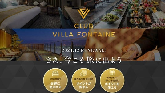 日本全国でホテルや温浴施設などを運営する住友不動産ヴィラフォンテーヌ株式会社(本社:東京都新宿区、代表取締役:小森智之、以下「当社」)は、運営する会員プログラム「CLUB VILLA FONTAINE(クラブ ヴィラフォンテーヌ、入会金・年会費無料)」の内容を大幅に刷新し、会員アプリのバージョンアップ、宿泊予約システムの入替を行い、2024年12月2日(月)16時より運用を開始いたします。