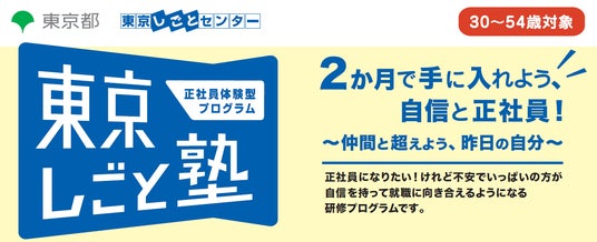 公益財団法人東京しごと財団(所在地:東京都千代田区)では、都内で正社員就職を目指す30~54歳の求職者を対象に、正社員体験型プログラム「東京しごと塾」を実施しています。キャリアデザインのためのプログラムを受講後、企業で働くことを想定した2か月間の職務実習を通じて正社員就職を目指します。