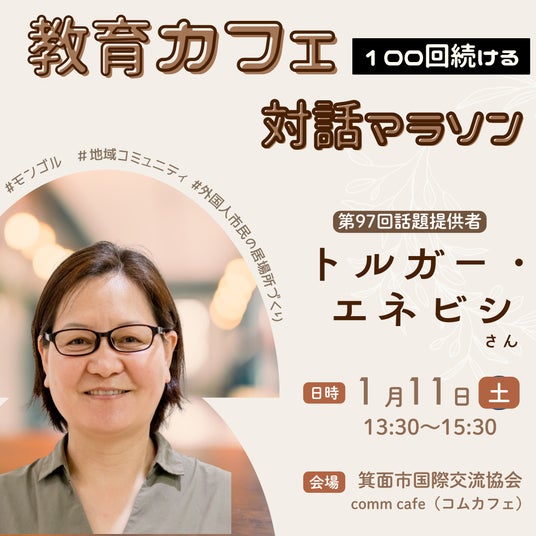 ゲストの話題提供から、対話を楽む教育カフェ。第97回は箕面市国際交流協会にある「comm cafe(コムカフェ)」にてお茶をいただきながら、モンゴルや外国人市民の居場所づくりについてお話を伺います。