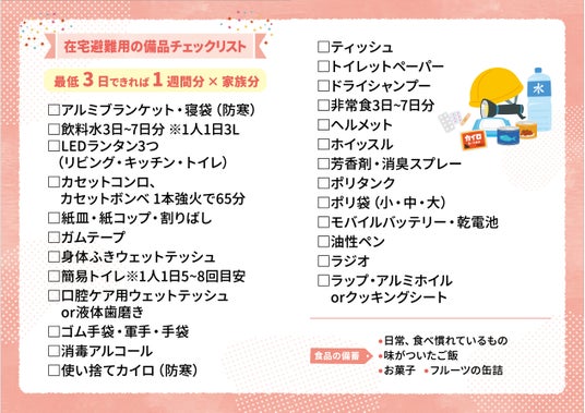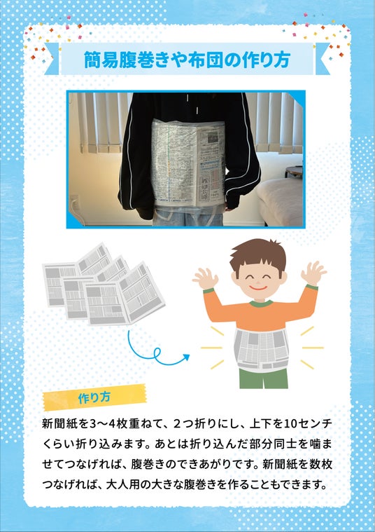 今回は、2024年1月1日に発生した能登半島地震の発生からまもなく1年が経過し、防災への関心が高まるこの時期に、防寒の工夫など冬の災害時の備えを確認できるよう本イベントを企画。ワークショップやぼうさいクイズに加え、新たに作成した「防災チェックリスト&ライフハックマニュアル」を配布します。在宅避難時に必要なアイテムと防災に関する知識を記載し、自宅の冷蔵庫などに貼り付けいつでも目にすることができるようにサイズとデザインを工夫。地域の皆さまが災害に対して適切に対策できるよう、具体的かつ実践的な情報を提供します。