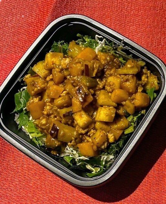 十日市場産のカボチャ・サツマイモのカレー炒め丼 【海鮮酒家 海陽飯店】