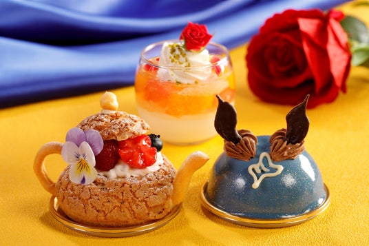 美女と野獣、ティーポット、キャンドル、時計などをモチーフにしたスイーツでティースタンドを飾り、「美女と野獣」の世界観を表現したアフタヌーンティー。旬のいちごをふんだんに使用し、物語のキーアイテムである“バラ”を散りばめた色鮮やかなスイーツとセイボリーをお楽しみいただけます。