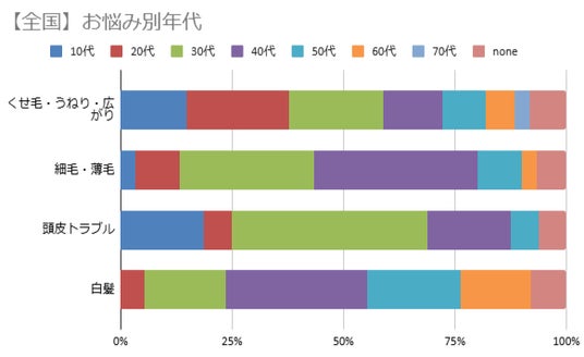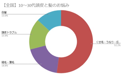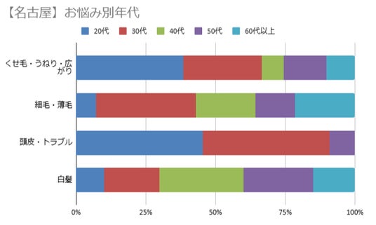 名古屋の女性は全国のなかでも美容にかける時間やお金が多いといわれています。若年層でその割合が高い結果となっていることから、美容感度が高い名古屋の女性の意識として「頭皮トラブル」があがっている可能性があります。一方で、くせ毛やうねり、広がりといった悩みも引き続き多くの人々の関心を集めています。