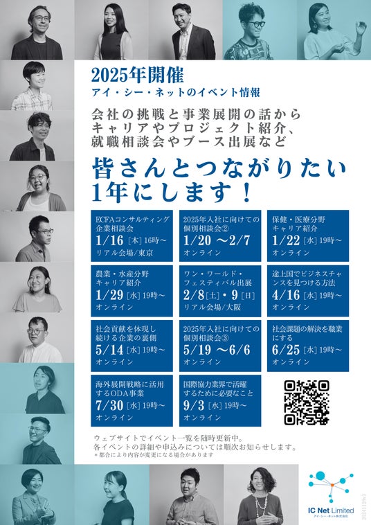 株式会社 学研ホールディングス(東京・品川/代表取締役社長:宮原博昭)のグループ会社、アイ・シー・ネット株式会社(埼玉・さいたま/代表取締役:百田顕児、以下、アイ・シー・ネット)は、海外進出を目指す企業やスタートアップの担当者、就職や転職を検討されている学生の方や社会人の皆さん向けに、情報収集の場として2025年に11回のイベントを開催いたします。会社の挑戦と事業展開の話から、キャリアやプロジェクト紹介、就職相談会やブース出展などまで、イベントの情報一覧を公開いたしました。