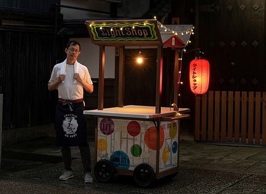 東京とニューヨークに拠点を置きながら制作活動を行う、ブラジル・サンパウロ生まれのアーティスト、大岩オスカール。それぞれの都市の環境や社会課題をテーマに風刺やユーモアを交えて描かれた、俯瞰的でダイナミックな絵画作品は高い評価を得ており、国内外の美術館にも多数作品が収蔵されています。京都 蔦屋書店での開催に続き、銀座での開催となる今回の個展では新作4点が加わり、「ライトショップ」というタイトルが示すように、光を象徴的に描いたシリーズを発表。健康な体を作りあげるためには食べ物が重要なように、心の栄養となる「精神的な食べ物」とはどんなものか、それを提供するお店とはどんなものかという想像から温かな物語が展開されます。光のもとに人々が集まる心地よい場所の象徴として、小さな「屋台」も会場に設置。