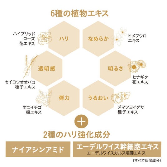 6種の植物エキスに、2種のハリ強化成分をプラス!