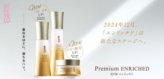 「RF28 エンリッチド」シリーズは、見た目の肌印象をつかさどる司令塔「美肌酵素※2」に着目したRF28最高峰のエイジングケア※1シリーズ。このたび、よりお客様にご満足いただける処方へ進化を遂げるため、実際にご愛用いただいているお客様の生の声をお伺いし、2023年秋の「ローション」に引き続き、2024年冬には新たに「エマルジョン」「クリーム」をリニューアル。美肌の6大ファクターへあらゆる角度からアプローチする従来のコンセプトはそのままに、先進の“美容施術”発想により圧倒的なハリ感をもたらすスキンケアへと生まれ変わります。