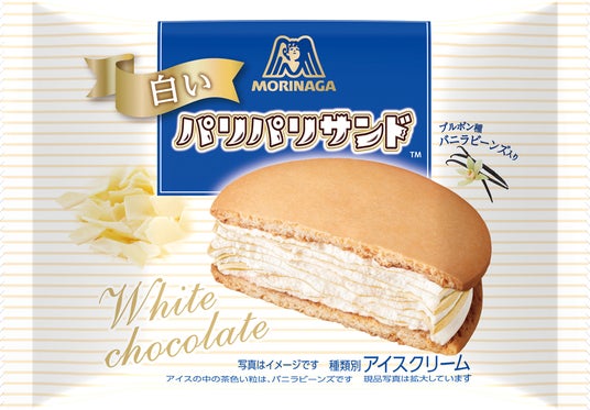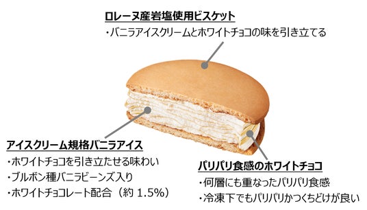 このたび発売する「白いパリパリサンド」は、パリパリ食感のホワイトチョコが楽しめるバニラアイスクリームを、しっとり食感のビスケットでサンドしました。バニラアイスクリームにもホワイトチョコを配合し、さらにブルボン種のバニラビーンズも加え、ホワイトチョコを引き立たせる味わいに仕立てました。また、ビスケットにロレーヌ産岩塩を使用し、アイスクリームとホワイトチョコの味を引き立てています。季節感のある味わいの新商品を発売することで、お客様に笑顔をお届けしてまいります。
