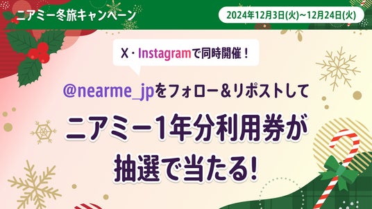 移動の課題に取り組むソーシャルデザインカンパニーの株式会社NearMe(本社:東京都中央区、代表取締役社長:高原幸一郎、以下:ニアミー)は、本日12月3日(火)から12月24日(日)までの期間限定でニアミー冬旅キャンペーンを開催します。ユーザーのみなさまへ日頃の感謝を込めて、豪華プレゼントが当たる抽選企画や、初回利用限定の特典をご用意しています。