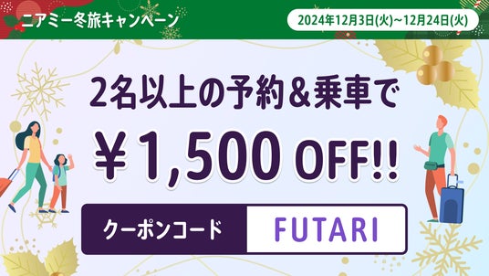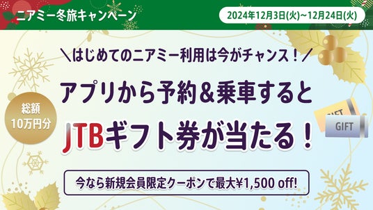 2024年は、日本版ライドシェアが一部解禁となるなど、移動の形が多様化した“ライドシェア元年”ともいえる変化の年となりました。また、今年の10月には、ニアミーが展開する空港と都市部を結ぶエアポートシャトルサービスの累計利用者数が10月時点で延べ90万人を突破。新しい“移動”の形を、多くの皆さまに体験していただけた1年となりました。そんな2024年の1年間の感謝を込めて、クリスマスシーズンに合わせ12月3日(火)から12月24日(日)までの期間限定で、皆さまの冬の移動や旅行をより快適なものにするため冬の特別キャンペーンを実施します。