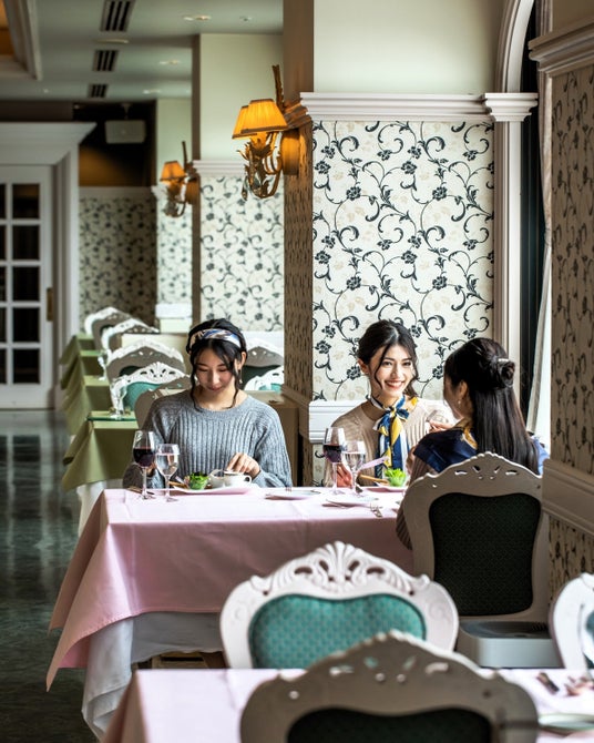 直営ハーブ園の新鮮野菜や福島和牛、三陸産魚介を活かしたメインダイニング。冬コースでは三陸産さくら真鯛のポワレや福島県産和牛ロース肉のステーキなどがラインナップ。