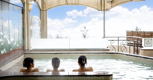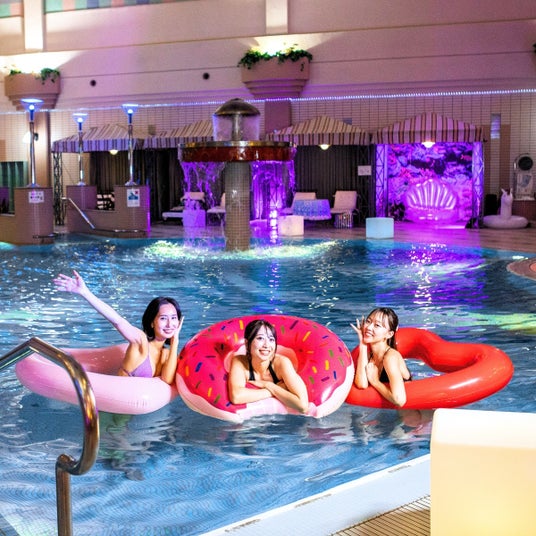 温泉プールやジェットバス、歩行湯、寝湯、打たせ湯、ドライ&スチームのサウナなどが揃う大型温浴施設。週末はカラフルなナイトプールも開催します。