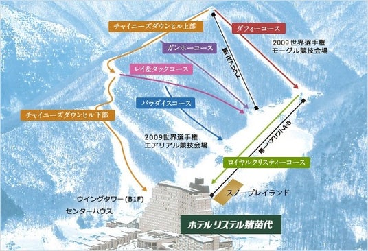 ゲレンデはホテルの正面。広々ファミリーコースとフリースタイルの世界選手権も開催される上級者コースが揃います。