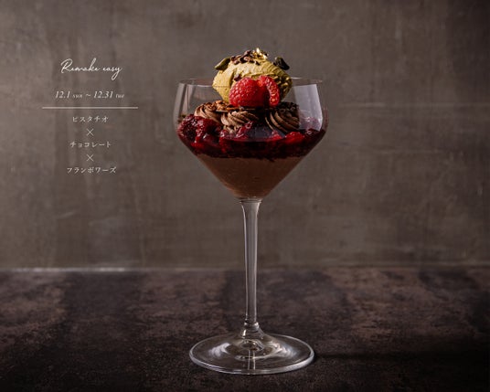 ピスタチオ×チョコレート×フランボワーズを使った、本場ヨーロッパのクリスマスをイメージした季節限定パフェが登場。住所非公開、会員制パフェバー「Remake easy」