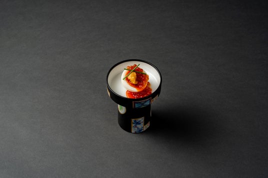 半熟に仕上げた濃紅玉子とウニを合わせ、上からたっぷりの「シラリカいくら」をかけました。柚子の香りがアクセントになっています。