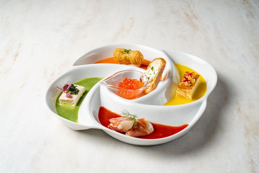 ランチコースの彩り豊かな5種類の前菜にそれぞれお好みの量の「シラリカいくら」をかけてお召上がりください。色々な食材との組み合わせで、いくらの新たな魅力を発見いただける一皿です。
