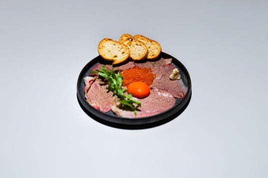 黒毛和牛の炙りカルパッチョ シラリカいくら、濃紅玉子、メルバ添え