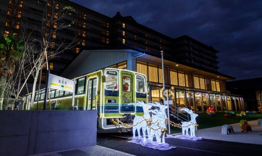龍宮亭前広場には今年の夏から廃棄予定の電車やバスの再利用と併せて、“龍宮城駅”を開設しており、お客様からご好評をいただいています。今回、電車と龍宮城駅にWinterイルミネーションを施し華やかさを演出しました。また、12月25日(水)まではXmasバージョンの装飾をまとい、車内からはサンタクロースがチラ見するなど華やかな光とともに周囲はほっこりとした空気に包まれています。
