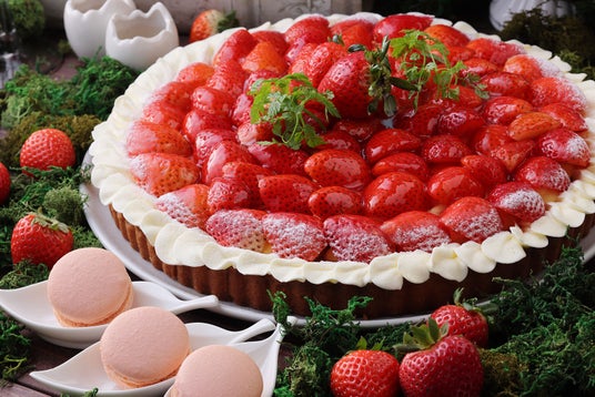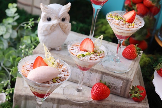 スイーツビュッフェのスタートはノンアルコールカクテル【ストロベリーモヒート】から。ビュッフェラインには多彩ないちごスイーツが並び、散歩道に遊びに来た動物たちの顔ぶれも。先ずは【国産苺の食べ比べ3種】でフレッシュな味わいを楽しんで。滋賀県初のオリジナル苺<みおしずく>をたっぷりトッピングした【30cmのフレッシュ苺タルト】は、滋賀県産の牛乳を使用したカスタードクリームの風味がマッチし見た目も華やかなスイーツです。