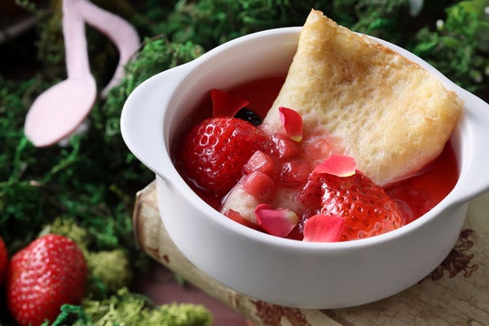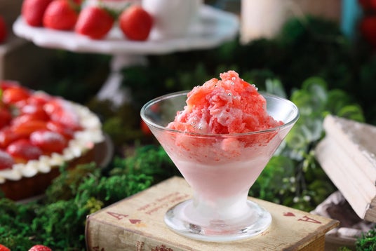 タイムサービスの苺スイーツは2種類!形が不揃いの苺と桃とベリーで作ったシロップをかき氷にした【いちごおり】と、角切り苺とブルーベリーを煮込んだ温かいソースで召し上がっていただく【苺のクレープシュゼット】をどうぞ。