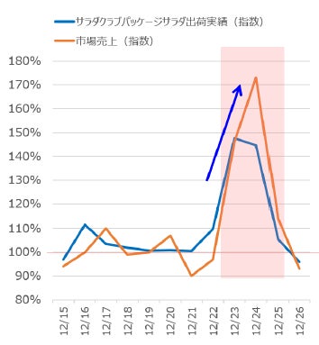 ※1 右図:昨年のデータでは、クリスマス前(12/3~12/9)とクリスマス(12/23~25)を比較すると、市場売上は約1.7倍、当社の出荷実績は約1.5倍に伸長しており、クリスマスは特にパッケージサラダの需要が高いことがわかります。